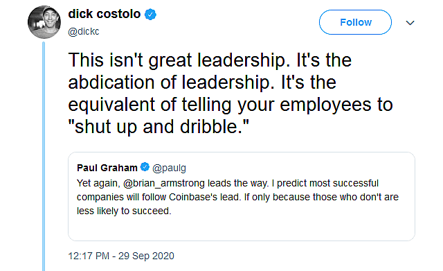 This announcement prompted a response from Costolo, who stated that Armstrong’s statement was “the equivalent of telling your employees to shut up and dribble.”