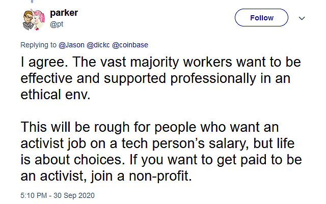 “This will be rough for people who want an activist job on a tech person’s salary, but life is about choices,” said Thompson. “If you want to get paid to be an activist, join a non-profit.”