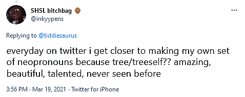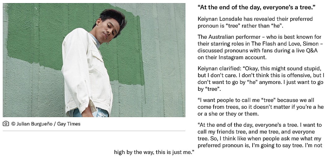 Tree pronouns? Honestly, what are we doing here? Does Lonsdale realize that this makes tree sound completely idiotic to even the people who support the concept of pronouns?