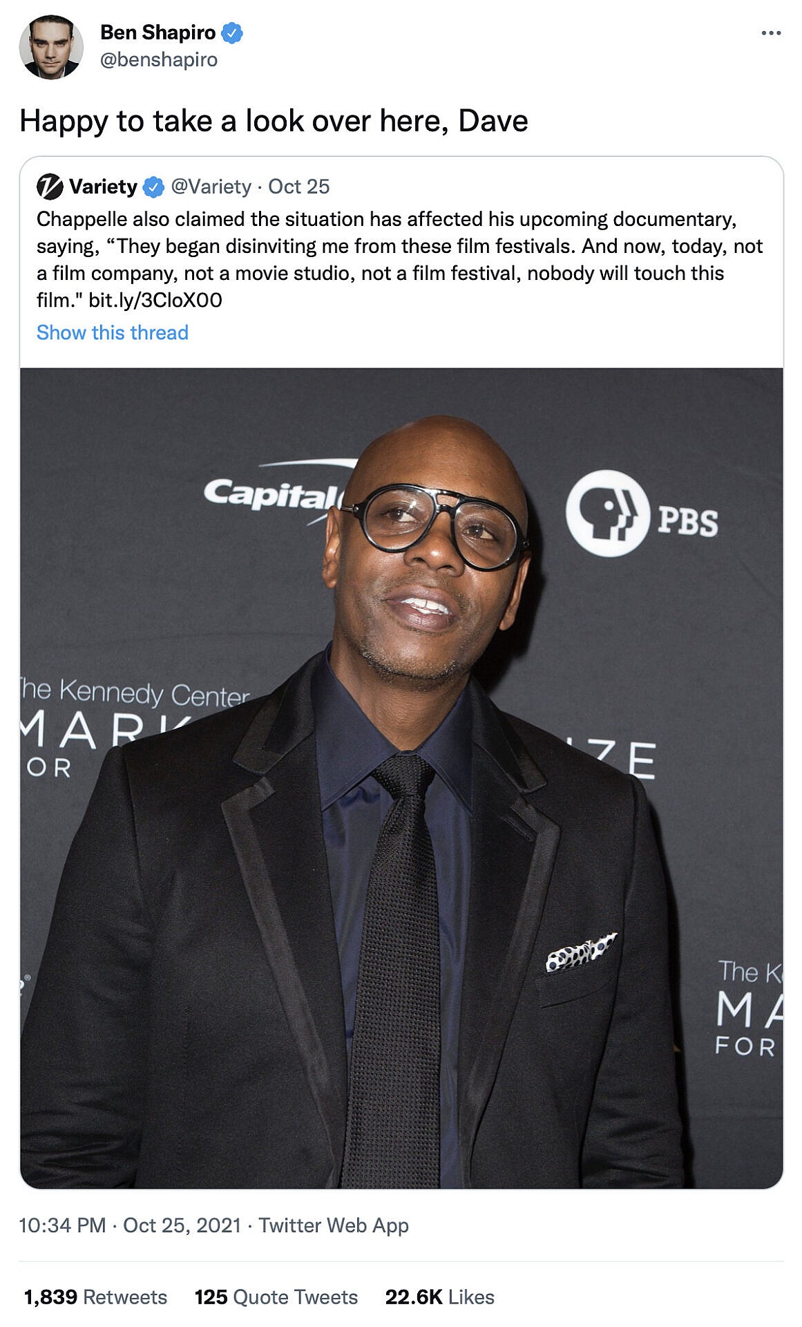 Upon hearing about the news regarding Chappelle’s documentary being shunned, The Daily Wire co-founder Ben Shapiro entertained the idea of giving the comedian a helping hand, simply tweeting, “Happy to take a look over here, Dave.”