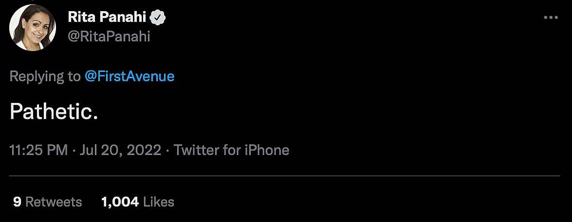 Sky News host Rita Panahi simply described First Avenue’s hypocritical statement about the show’s cancellation as “Pathetic.”