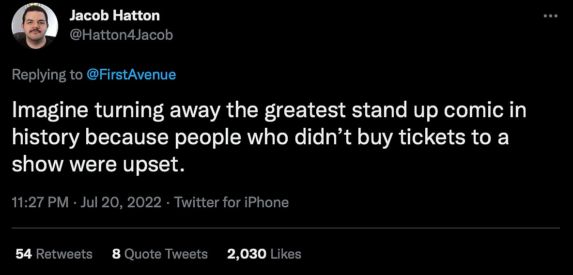 “Imagine turning away the greatest stand up comic in history because people who didn’t buy tickets to a show were upset,” opined Jacob Hatton.