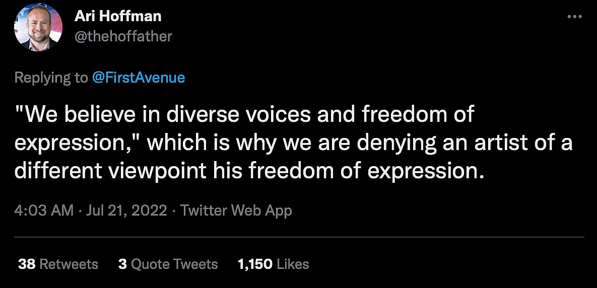 Associate editor of The Post Millennial Ari Hoffman called out the venue’s “We believe in diverse voices and freedom of expression” claim, noting, “which is why we are denying an artist of a different viewpoint his freedom of expression.”