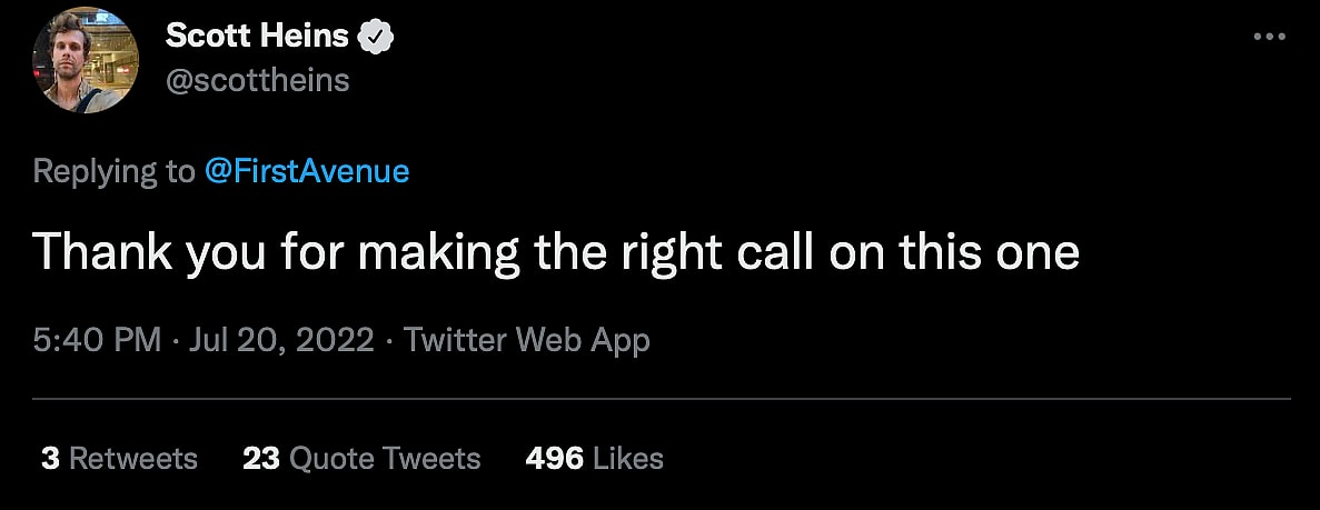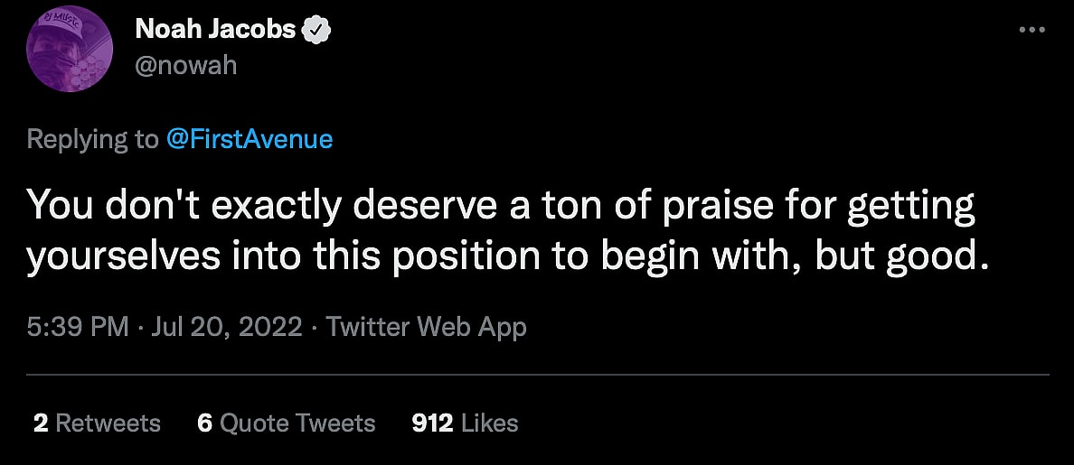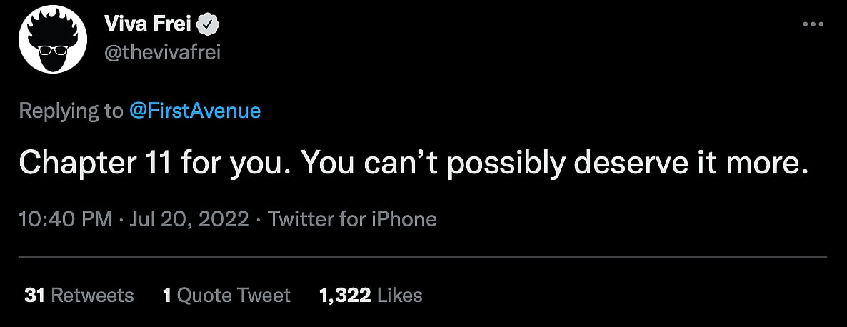 Lawyer and YouTuber Viva Frei pulled no punches, stating, “Chapter 11” making allusion to the United States Bankruptcy Code and suggesting First Avenue file for bankruptcy, adding, “You can’t possibly deserve it more.”
