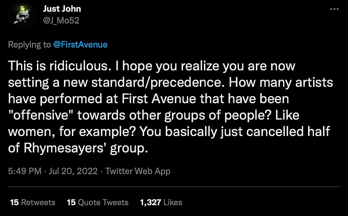 Twitter user @J_Mo52 declared, “This is ridiculous. I hope you realize you are now setting a new standard/precedence,” before pondering, “How many artists have performed at First Avenue that have been ‘offensive’ towards other groups of people? Like women, for example?”