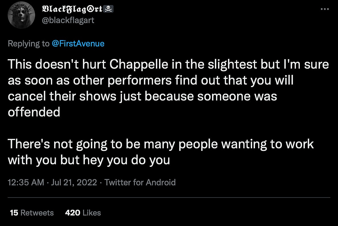 “This doesn’t hurt Chappelle in the slightest but I’m sure as soon as other performers find out that you will cancel their shows just because someone was offended, there’s not going to be many people wanting to work with you,” expressed @blackflagart, adding a cheeky, “but hey you do you.”