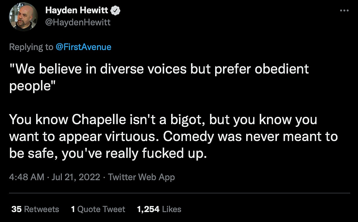 Filmmaker Hayden Hewitt was also critical of First Avenue’s tone-deaf statement, asserting, “‘We believe in diverse voices but prefer obedient people,'” and adding, “You know Chappelle isn’t a bigot, but you know you want to appear virtuous. Comedy was never meant to be safe, you’ve really f—ked up.”