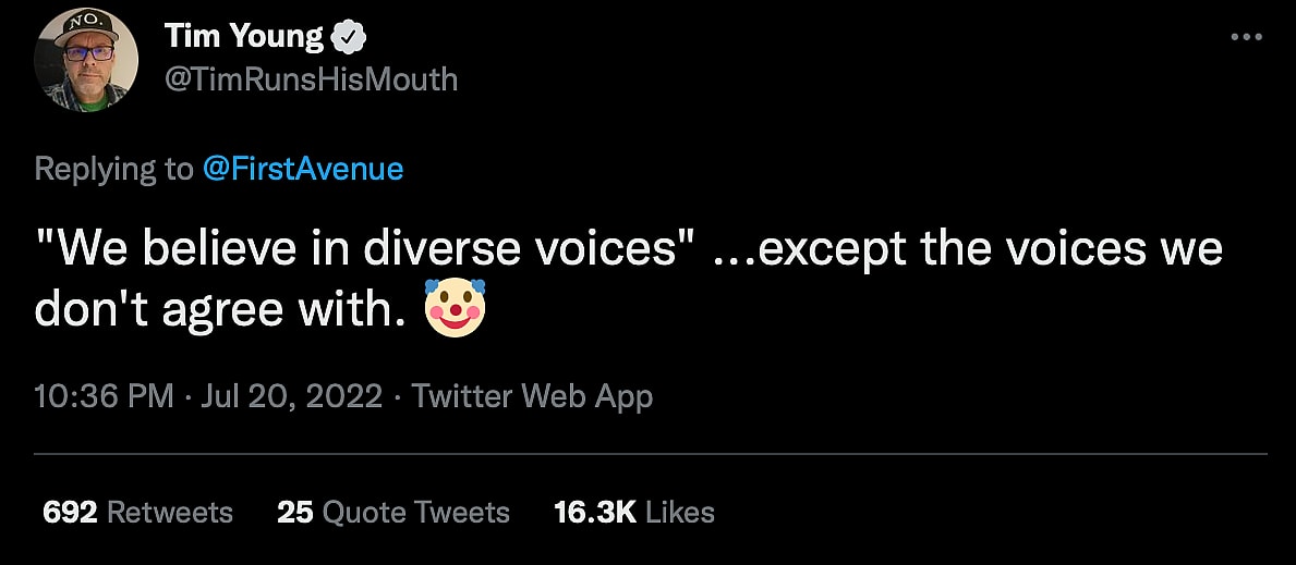 Political comedian and Washington Times columnist Tim Young mocked the performance venue’s claim that they “believe in diverse voices,” rightfully asserting, “…except the voices we don’t agree with.”