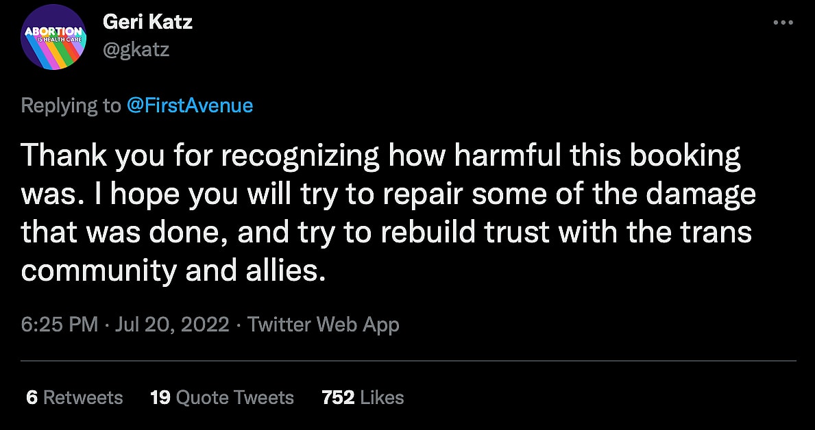 “Thank you for recognizing how harmful this booking was,” cried pro-murder advocate Geri Katz, who added, “I hope you will try to repair some of the damage that was done, and try to rebuild trust with the trans community and allies.”