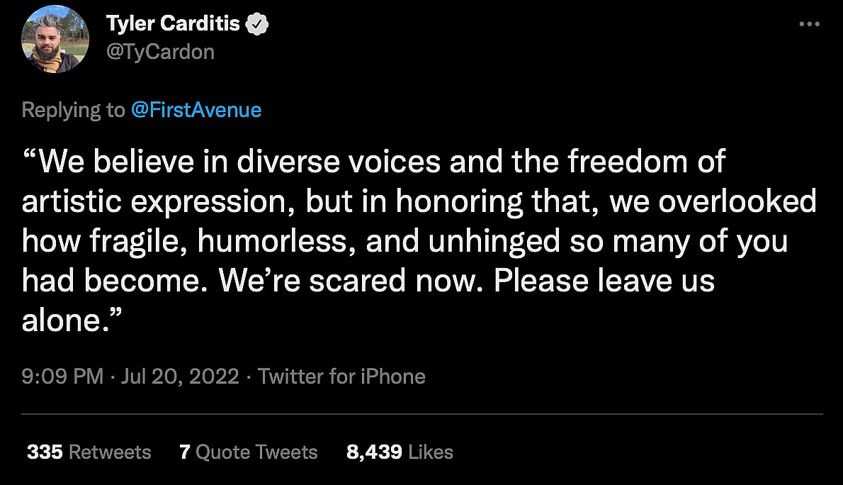 CEO of Blaze Media Tyler Cardon made a mockery of First Avenue’s hypocritical statement, writing, “We believe in diverse voices and the freedom of artistic expression, but in honoring that, we overlooked how fragile, humorless, and unhinged so many of you had become. We’re scared now. Please leave us alone.”