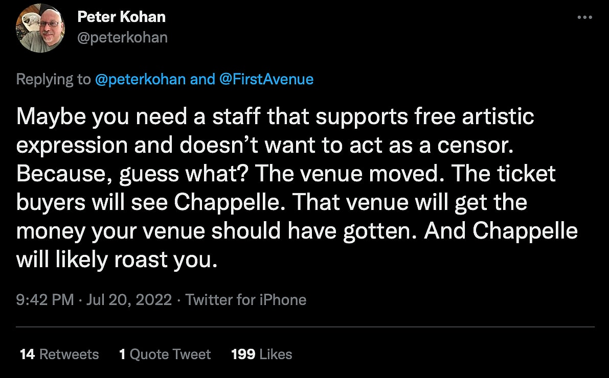 Peter Kohan suggested, “Maybe you need a staff that supports free artistic expression and doesn’t want to act as a censor. Because, guess what? The venue moved. The ticket buyers will see Chappelle. That venue will get the money your venue should have gotten. And Chappelle will likely roast you.”