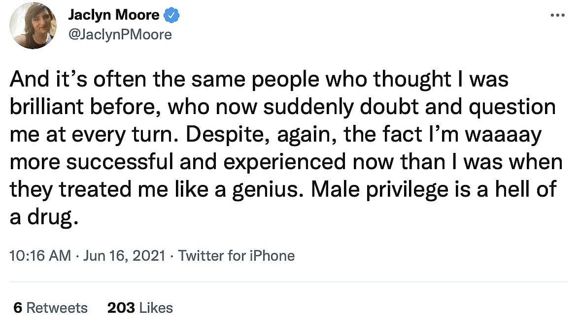 “And it is often the same people who thought I was brilliant before, who now suddenly doubt and question me at every turn,” Moore added in a follow-up tweet. “Despite, again, the fact I’m waaaay more successful and experienced now than I was when they treated me like a genius. Male privilege is a hell of a drug.”