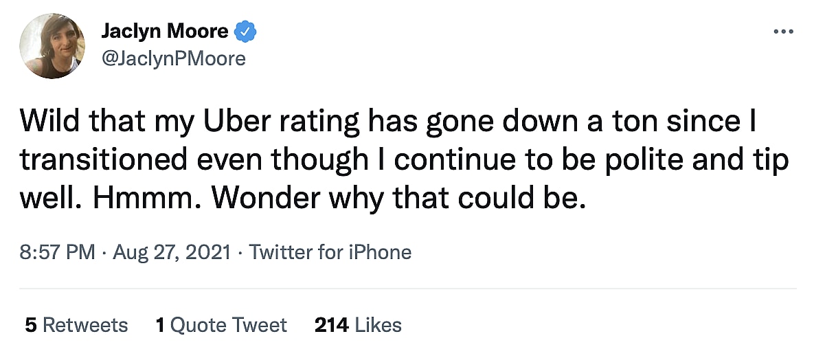 Moore would also claim, “Wild that my Uber rating has gone down a ton since I transitioned even though I continue to be polite and tip well. Hmmm. Wonder why that could be.”