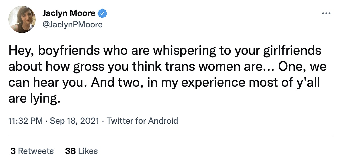 “I’m just going to start blaming normal s—t on being trans,” Moore ironically proposed a few weeks ago. “Alarm didn’t go off? Transphobia. Flat tire? Transmisogyny. My stomach hurts after I have ice cream? It’s not because I’m lactose intolerant. It’s because this lactose is trans intolerant.”