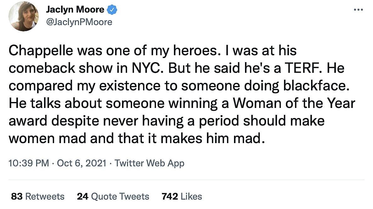 According to Moore, “Chappelle was one of my heroes. I was at his comeback show in NYC. But he said he’s a TERF,” – or Trans-Exclusionary Radical Feminist, a term that some members of the transgender community quite literally use to refer to feminists who are anti-trans activists – “He compared my existence to someone doing blackface.”