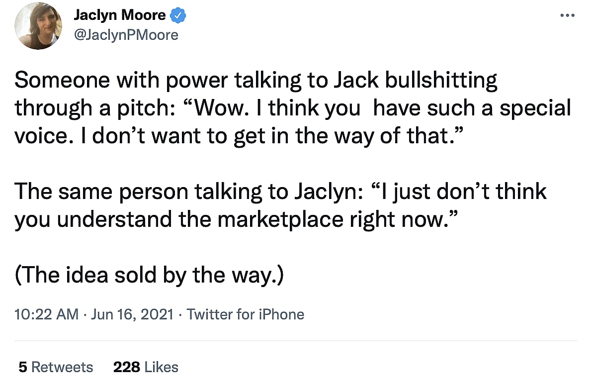 “Someone with power talking to Jack bulls—tting through a pitch: ‘Wow. I think you have such a special voice. I don’t want to get in the way of that,'” wrote Moore. “The same person talking to Jaclyn: ‘I just don’t think you understand the market place right now,'” providing zero evidence that this is a legitimate experience.