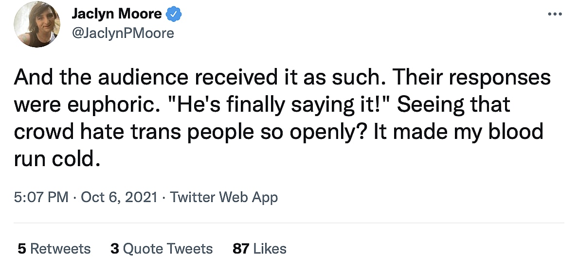 Moore continued, “And the audience received it as such. Their responses were euphoric. ‘He’s finally saying it!’ Seeing that crowd hate trans people so openly? It made my blood run cold.”