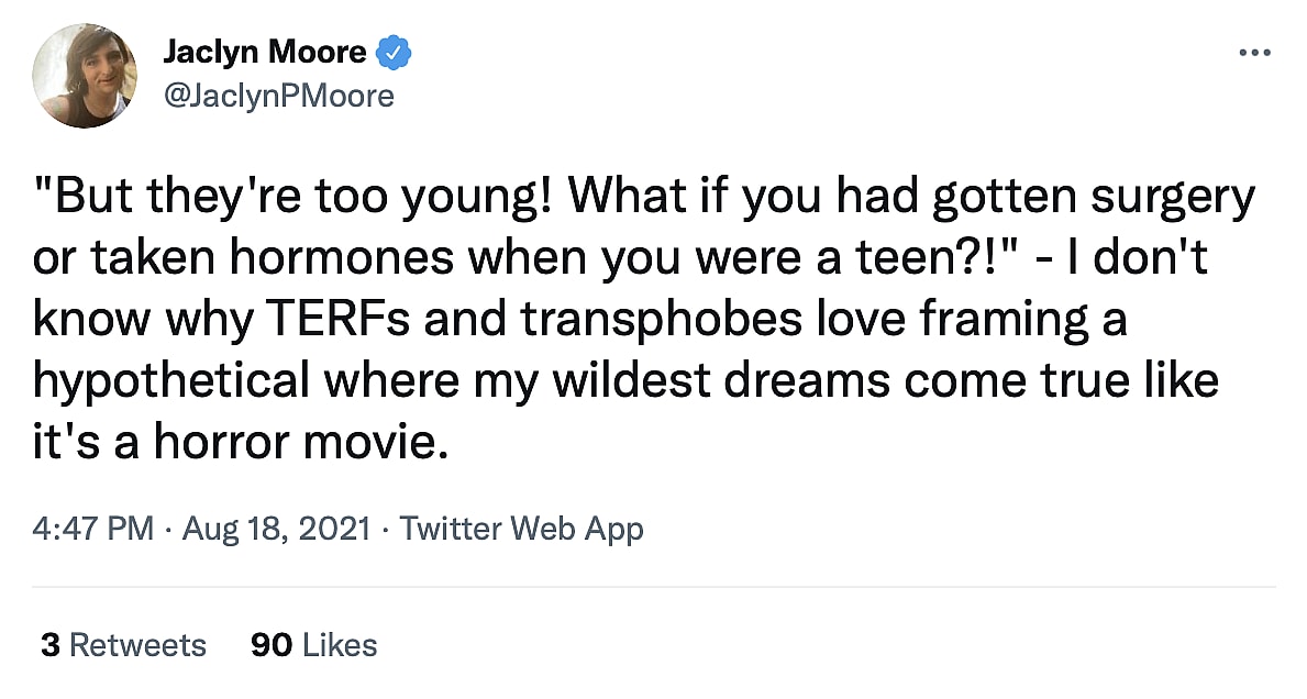 In yet another tweet that appears to be an attempt at sparking controversy, Moore wrote, “‘But you’re too young! What if you had gotten surgery or taken hormones when you were a teen?!’ – I don’t know why TERFs and transphobes love framing a hypothetical where my wildest dreams come true like it’s a horror movie.”