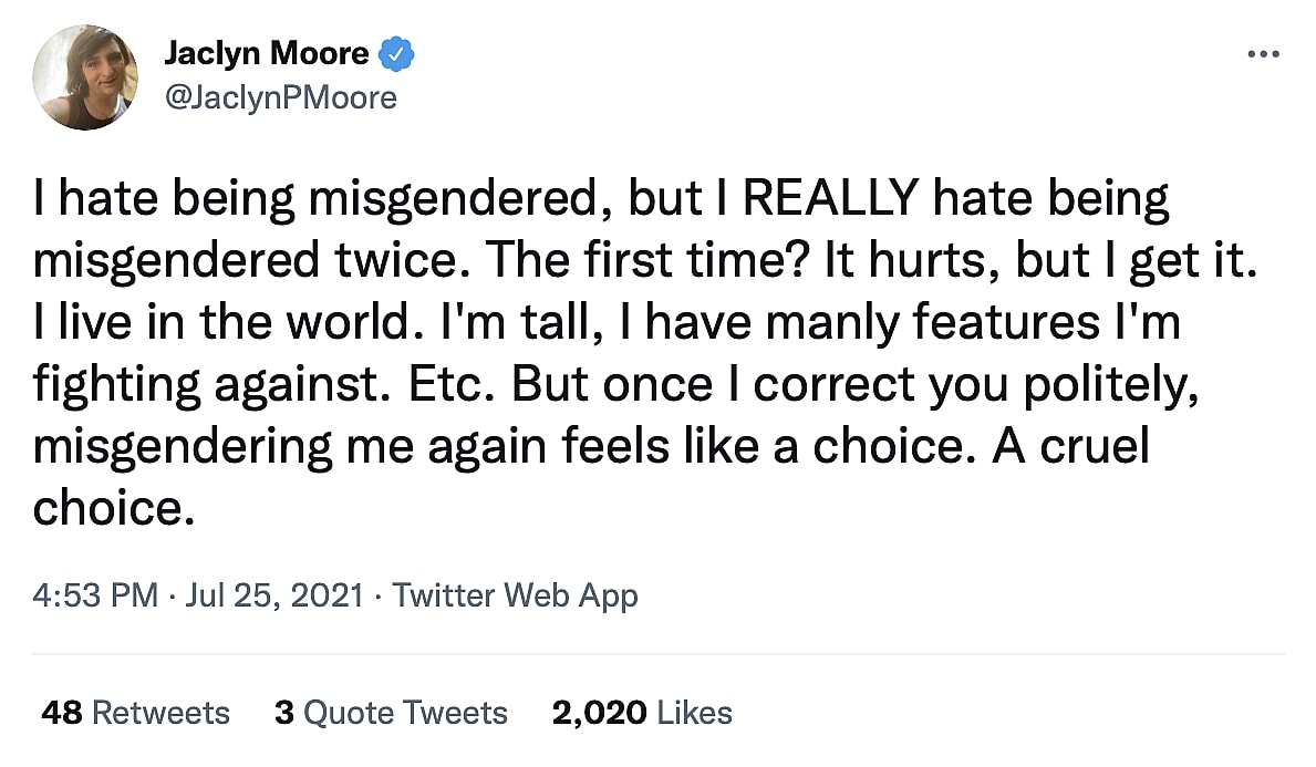 “I hate being misgendered, but I REALLY hate being misgendered twice,” declared Moore in yet another tweet where no evidence was provided.  “The first time? It hurts, but I get it. I live in the world. I’m tall, I have manly features I’m fighting against. Etc. But once I correct you politely, misgendering me again feels like a choice. A cruel choice.”