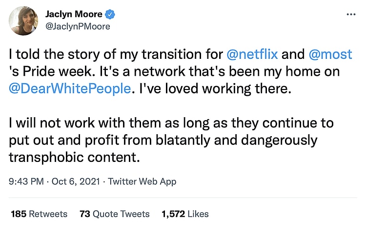 “I told the story of my transition for @netflix and @most ‘s Pride week. It’s a network that’s been my home on @DearWhitePeople. I’ve loved working there,” wrote Moore on Twitter, following the release of Dave Chappelle’s The Closer special before declaring, “I will not work with them as long as they continue to put out and profit from blatantly and dangerously transphobic content.”