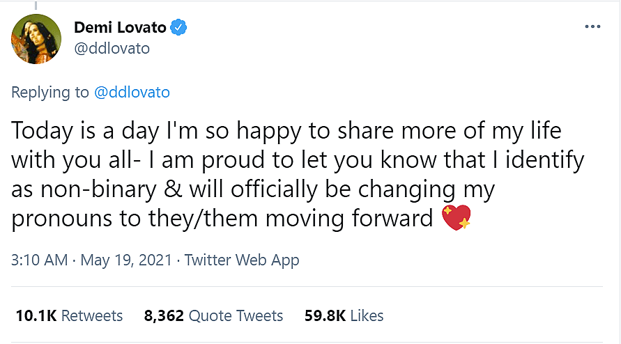 “Today is a day I’m so happy to share more of my life with you all- I am proud to let you know that I identify as non-binary & will officially be changing my pronouns to they/them moving forward,” Lovato tweeted at the time.