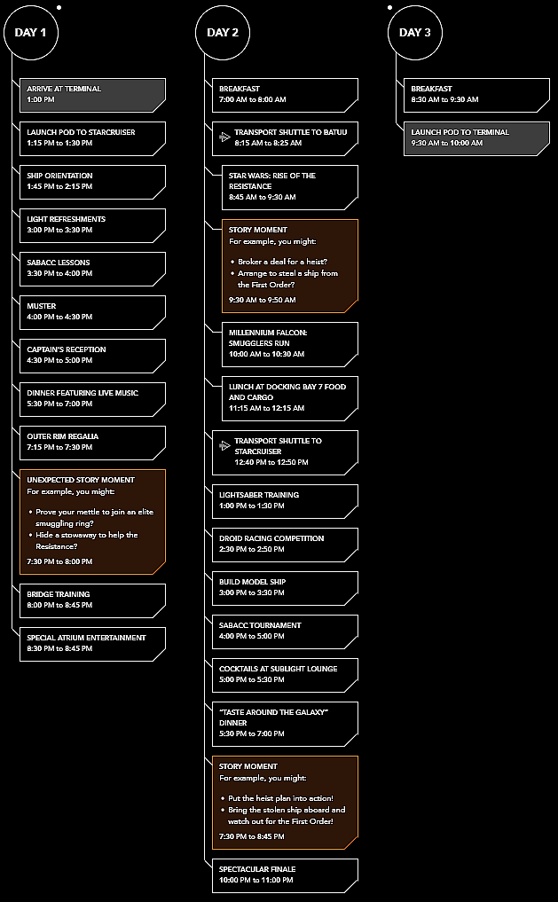 Alongside the experience’s ticket prices, Disney also released a “sample itinerary” of Galactic Cruiser’s going-ons, which shows that not only will guests be able to take part in various ‘on-board’ activities, but they will also encounter “unexpected surprises” known as ‘story moments’.