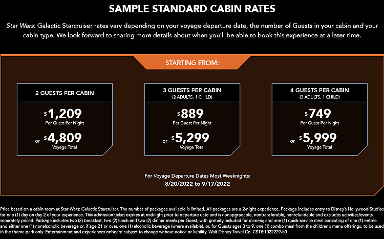 The prices only grow exponentially from there, as a ticket for three guests, including “2 adults, 1 child”, will run Galactic Cruiser attendees “$889 USD per guest per night or #5,299 USD voyage total,” while a four guest ticket for “3 adults, 1 child” will be sold for “$749 USD per guest per night or $5,999 voyage total”.