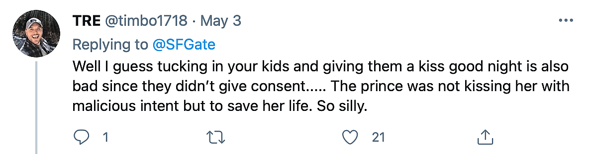 With yet another valid point, Twitter user @timbo1718 stated, “Well I guess tucking in your kids and giving them a kiss good night is also bad since they didn’t give consent…..” and noted that “The prince was not kissing her with malicious intent but to save her life. So silly.”
