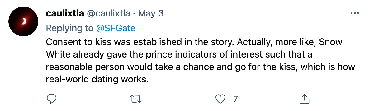 “Actually,” they added, “more like, Snow White already gave the prince indicators of interest such that a reasonable person would take a chance and go for the kiss, which is how real-world dating works.”