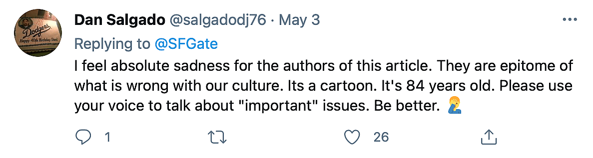 “I feel absolute sadness for the authors of this article,” reads a comment shared by Twitter user @salgadodj76. “They are epitome of what is wrong with our culture. Its a cartoon. It’s 84 years old. Please use your voice to talk about “important” issues. Be better.”