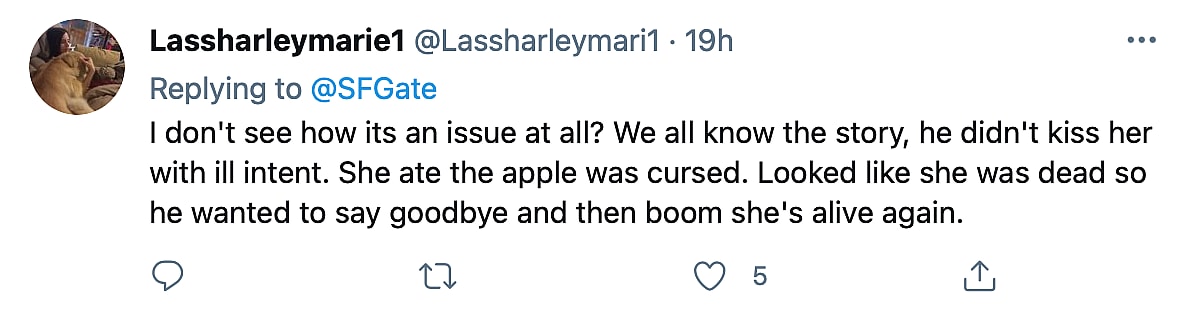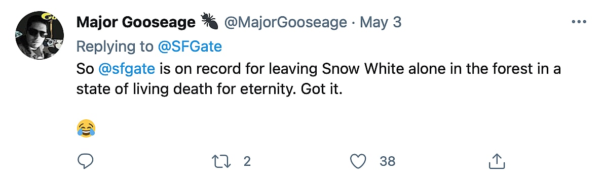 “So @sfgate is on record for leaving Snow White alone in the forest in a state of living death for eternity. Got it,” commented Twitter user @MajorGooseage. He makes a very valid point; had it not been for Prince Charming’s kiss, Snow White would’ve died waiting for the “true love’s kiss.”