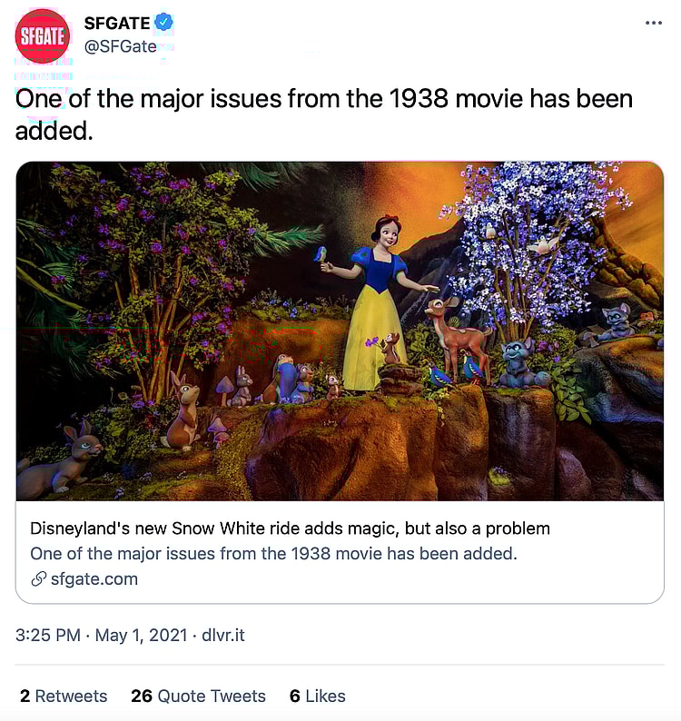 “Worse [sic] article I have ever read in my life,” Twitter user @CalvinFrank expressed in regards to SFGate’s take on the kiss in the recently opened Snow White Enchanted Wish ride. “You are completely out of touch to allow such an article,”