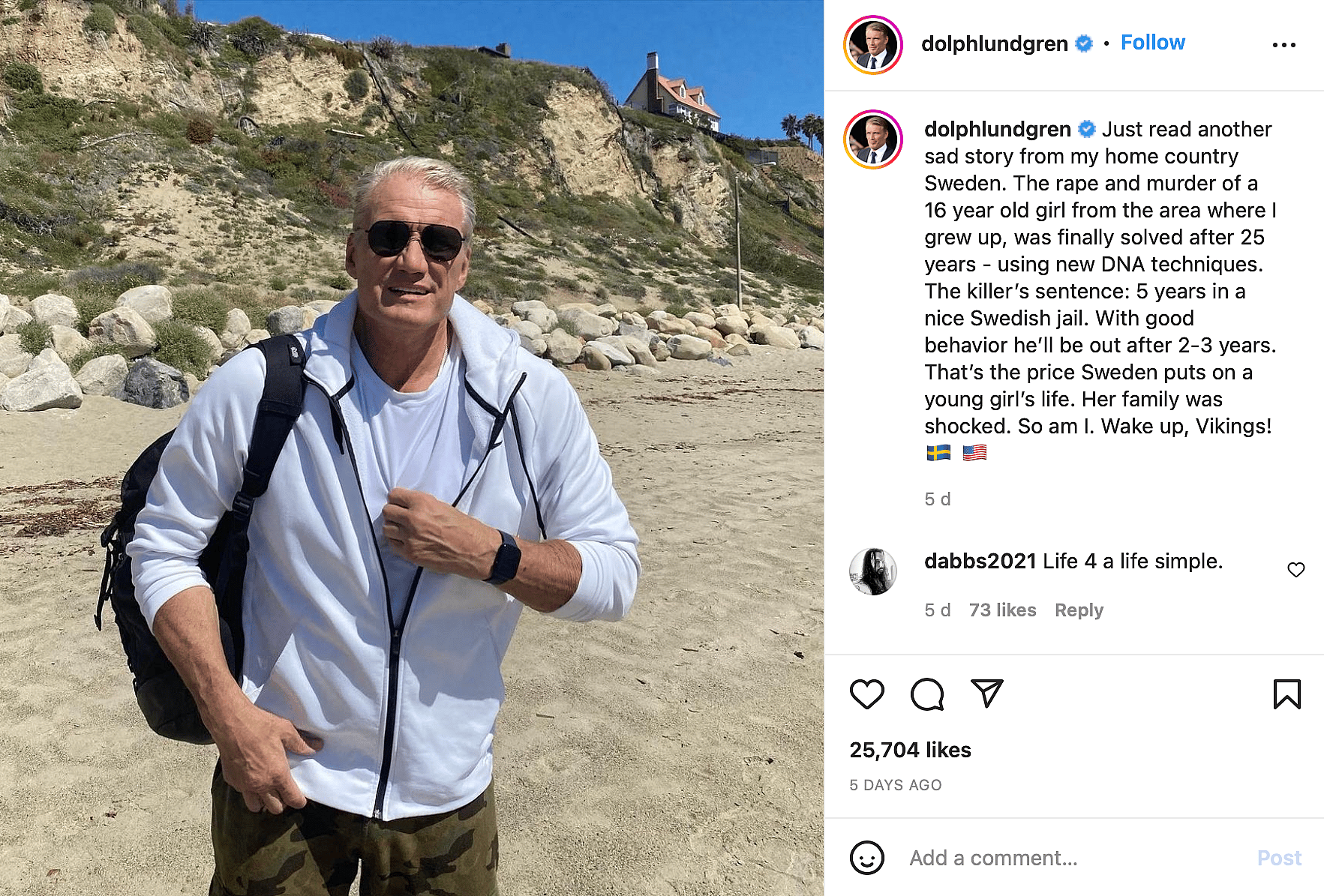 On July 27th, Lundgren took to his personal Instagram account to inform his followers, “Just read another sad story from my home country Sweden. The rape and murder of a 16 year old girl from the area where I grew up, was finally solved after 25 years – using new DNA techniques.”