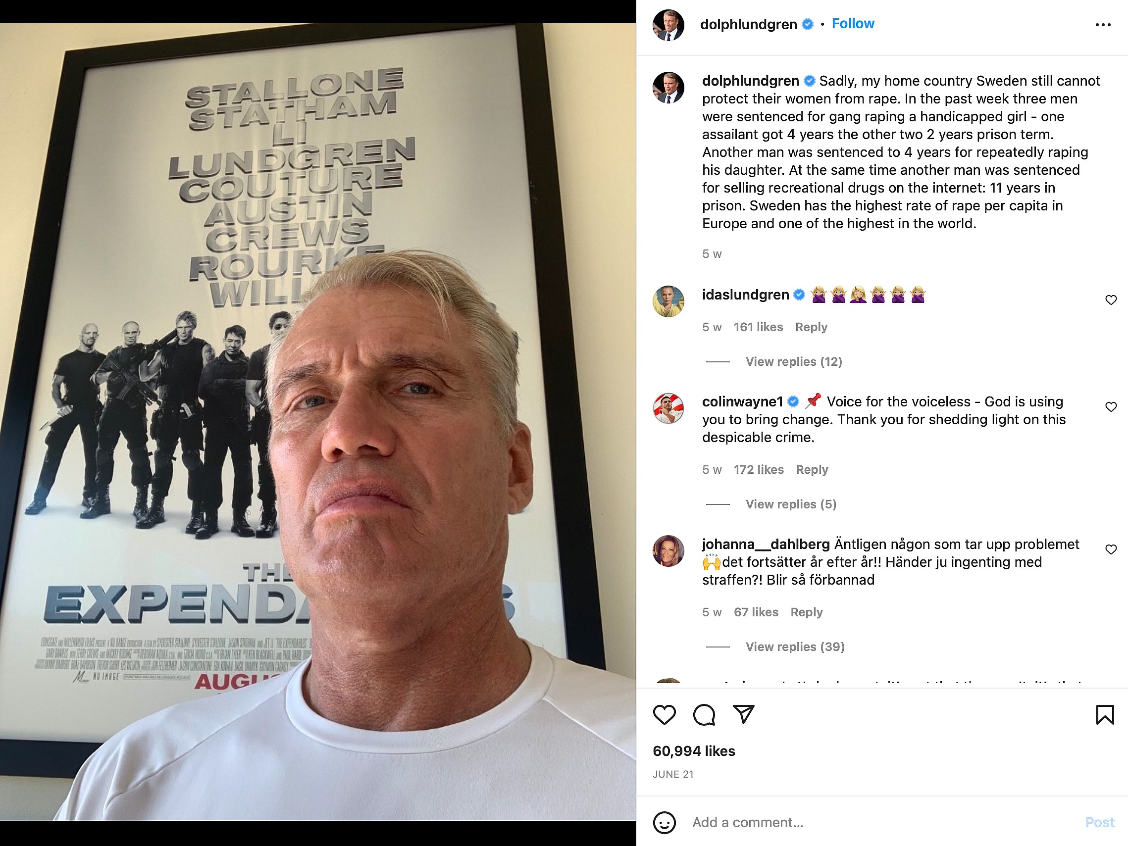 “Sadly, my home country Sweden still cannot protect their women from rape,” wrote Lundgren on his Instagram. “In the past week three men were sentenced for gang raping a handicapped girl – one assailant got 4 years the other two 2 years prison term.”