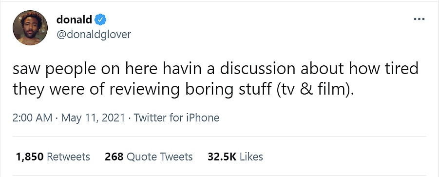 Glover took to Twitter, where he first observed that a number of other Twitter users were saying current movies and TV series are boring.