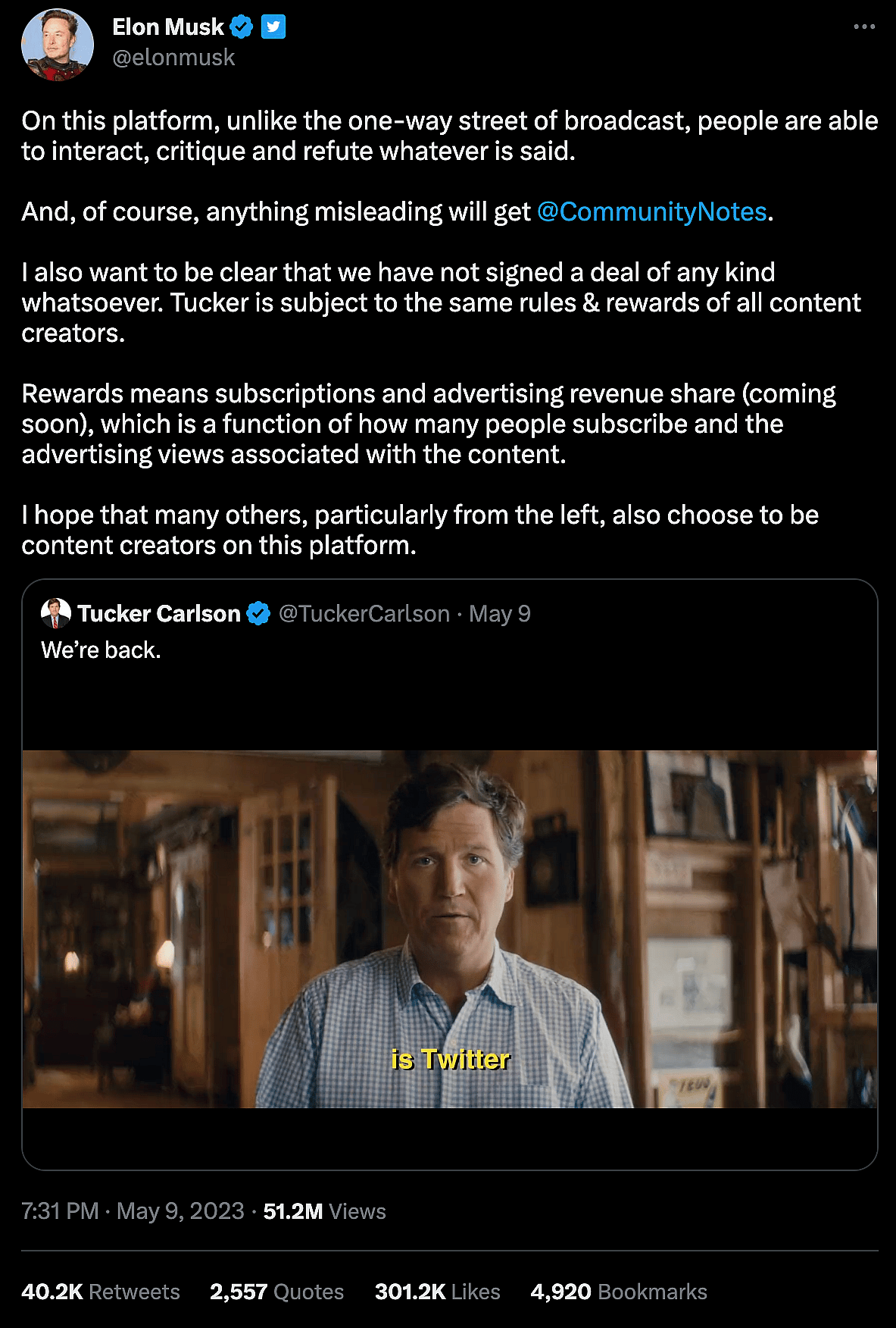 Offering further information on this supposed deal, Musk would retweet Carlson’s announcement later that same day and add, “On this platform, unlike the one-way street of broadcast, people are able to interact, critique and refute whatever is said.