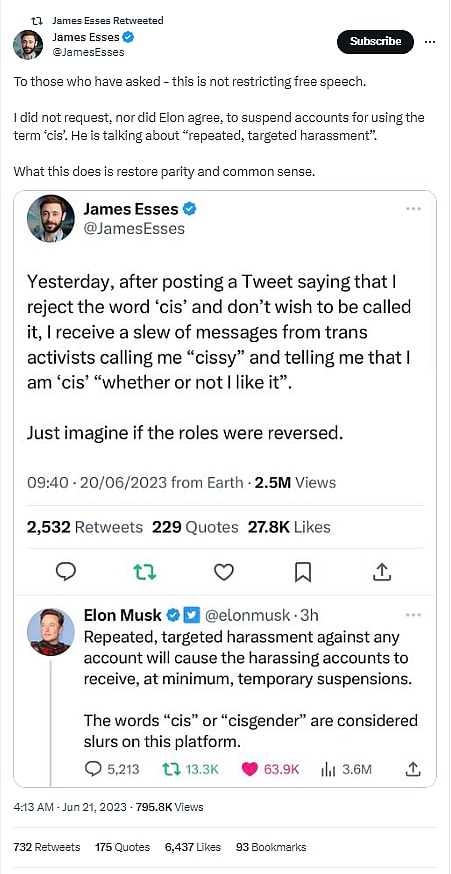 He added, “I did not request, nor did Elon agree, to suspend accounts for using the term ‘cis’. He is talking about ‘repeated, targeted harassment’.”