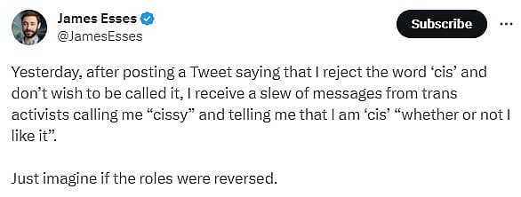 “Yesterday, after posting a Tweet saying that I reject the word ‘cis’ and don’t wish to be called it, I receive a slew of messages from trans activists calling me ‘cissy’ and telling me that I am ‘cis’ ‘whether or not I like it’,” he wrote. “Just imagine if the roles were reversed.”
