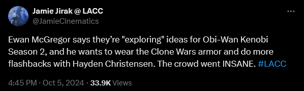 From there, he then asked the crowd, “I just hope we can do another one. Can everyone write to Disney? If we just – I’ll give you some email addresses at the end – Just say ‘Dear Disney, let’s have another. Let’s have a bit more of Obi-Wan Kenobi, please.”