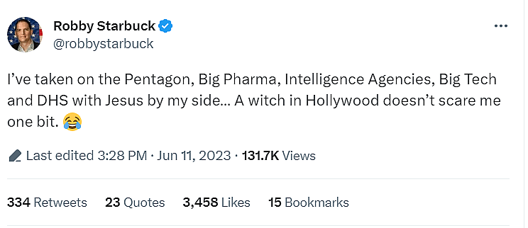 He added, “I’ve taken on the Pentagon, Big Pharma, Intelligence Agencies, Big Tech and DHS with Jesus by my side… A witch in Hollywood doesn’t scare me one bit.”