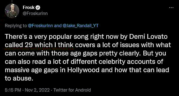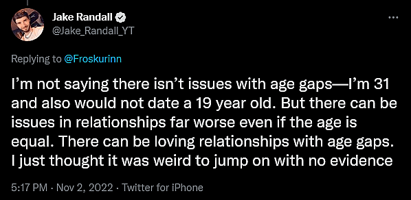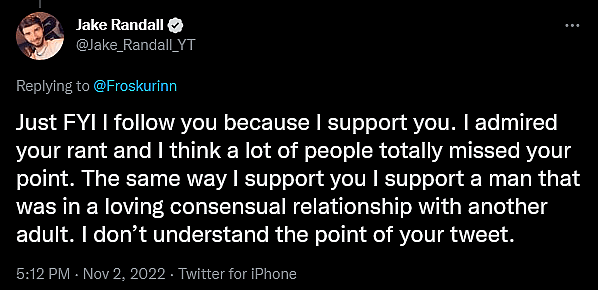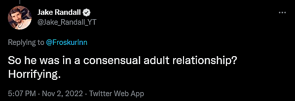 “So he was in a consensual adult relationship?” sarcastically asked YouTuber Jake Randall. “Horrifying.”