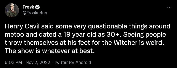 “Henry Cavil said some very questionable things around #MeToo and dated a 19 year old as 30+,” wrote the former Xplay host. “Seeing people throw themselves at his feet for The Witcher is weird. The show is whatever at best.”