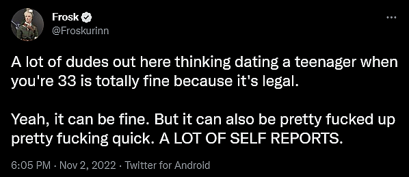 “A lot of dudes out here thinking dating a teenager when you’re 33 is totally fine because it’s legal,” she concluded. “Yeah, it can be fine. But it can also be pretty f–ked up pretty f–king quick. A LOT OF SELF REPORTS.
