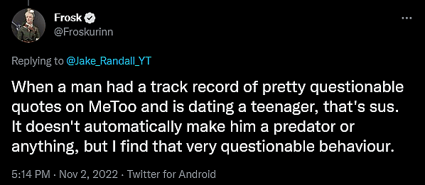 After having backpedaled from ‘Cavill is akin to a sexual predator’ to ‘I personally would never date someone with whom I had such age gap’, Frosk attempted to again reframe her accusation, this time opining, “When a man had a track record of pretty questionable quotes on MeToo and is dating a teenager, that’s sus.”