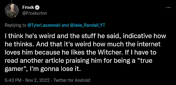 While many met this news with a mixture of emotions ranging from regret towards the wasted potential of his casting to relief that the actor no longer had to work with such bastardized material, Frosk saw an opportunity to virtue signal.