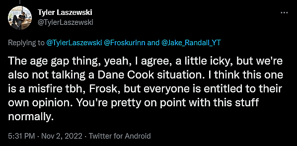 “There can be loving relationships with age gaps,” he acknowledged. “I just thought it was weird to jump on with no evidence.”