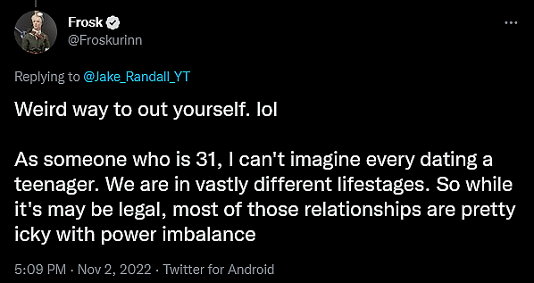 “Weird way to out yourself,” countered Frosk, disingenuously attempting to dismiss Randall as a sexual ‘creep’. “lol”.