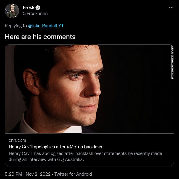 Frosk’s mention of Cavill’s “questionable” #MeToo comments is a reference to an interview the actor gave to GQ Australia in 2018.