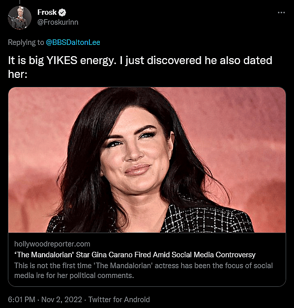 Finding herself on the losing end of the very discourse she had sparked, Frosk then proceeded to justify her shaming of Cavill on the grounds that he briefly dated former The Mandalorian star Gina Carano.