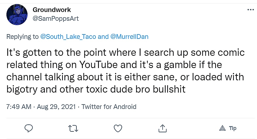 SamPoppsArt added, “It’s gotten to the point where I search up some comic related thing on YouTube and it’s a gamble if the channel talking about it is either sane, or loaded with bigotry and other toxic dude bro bulls***.”